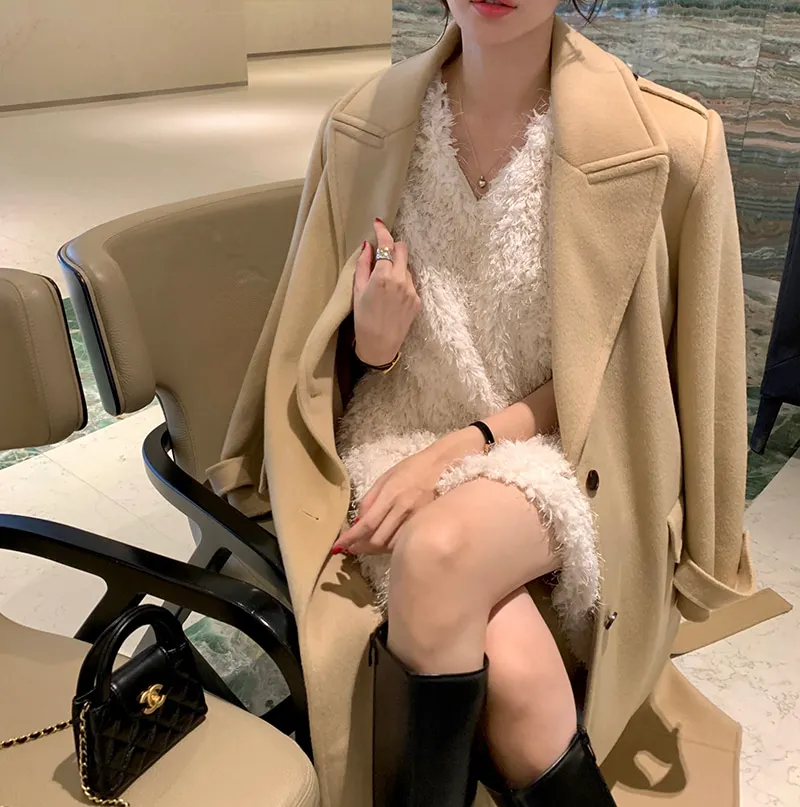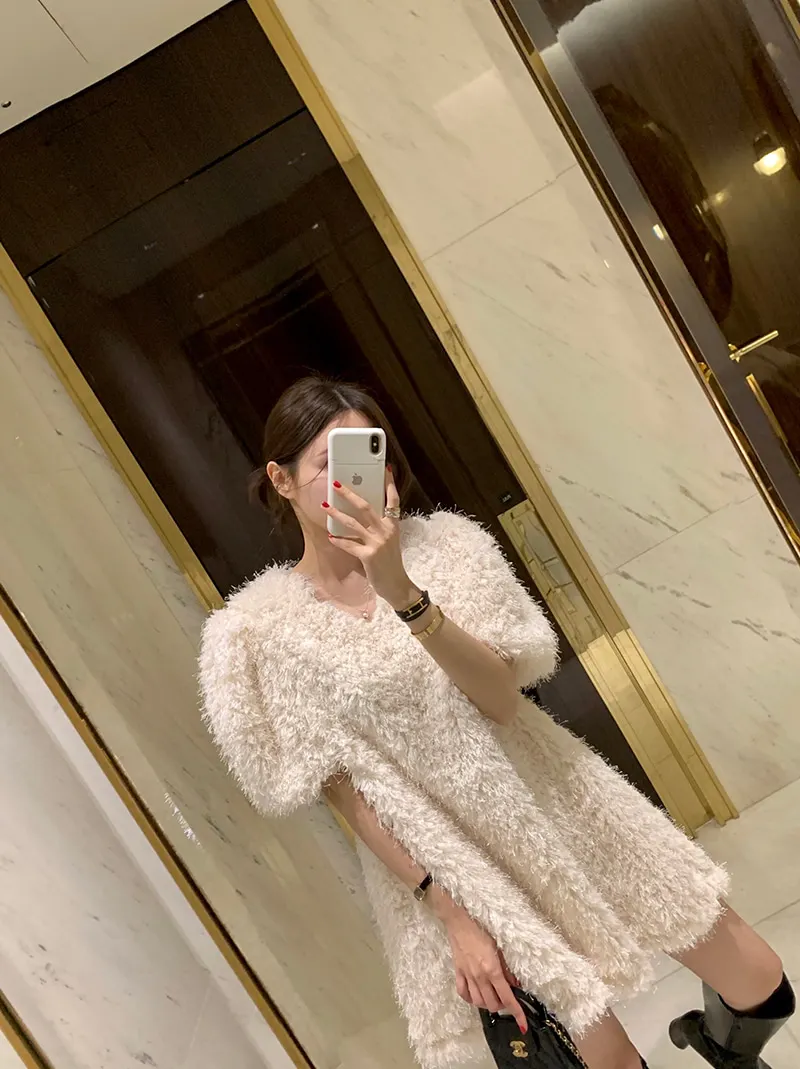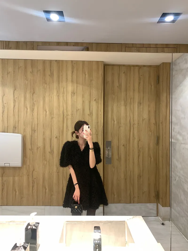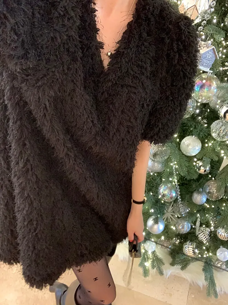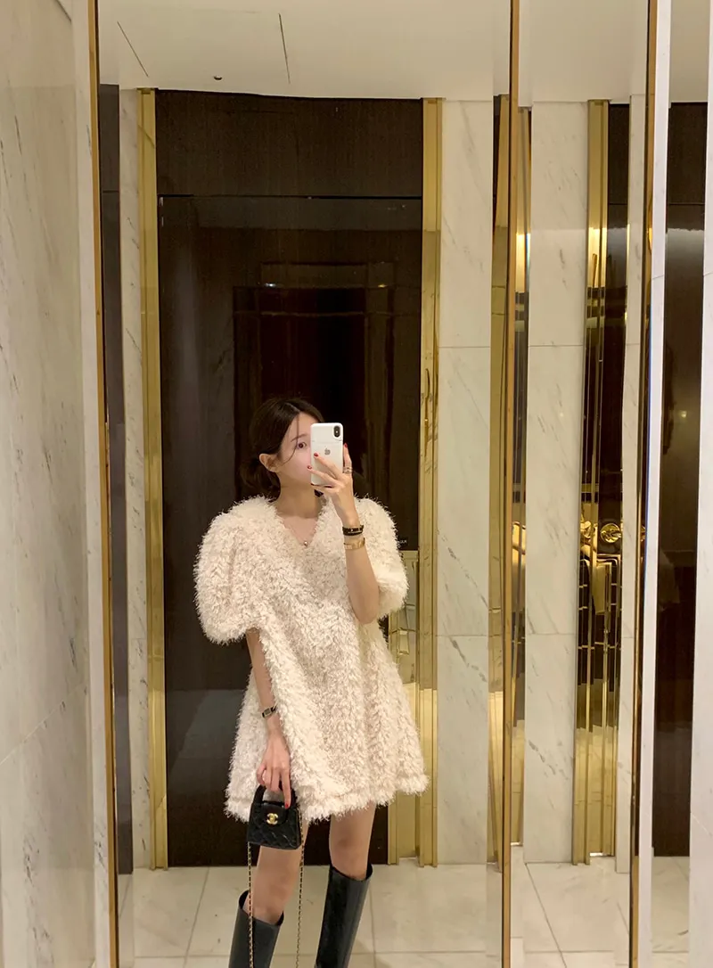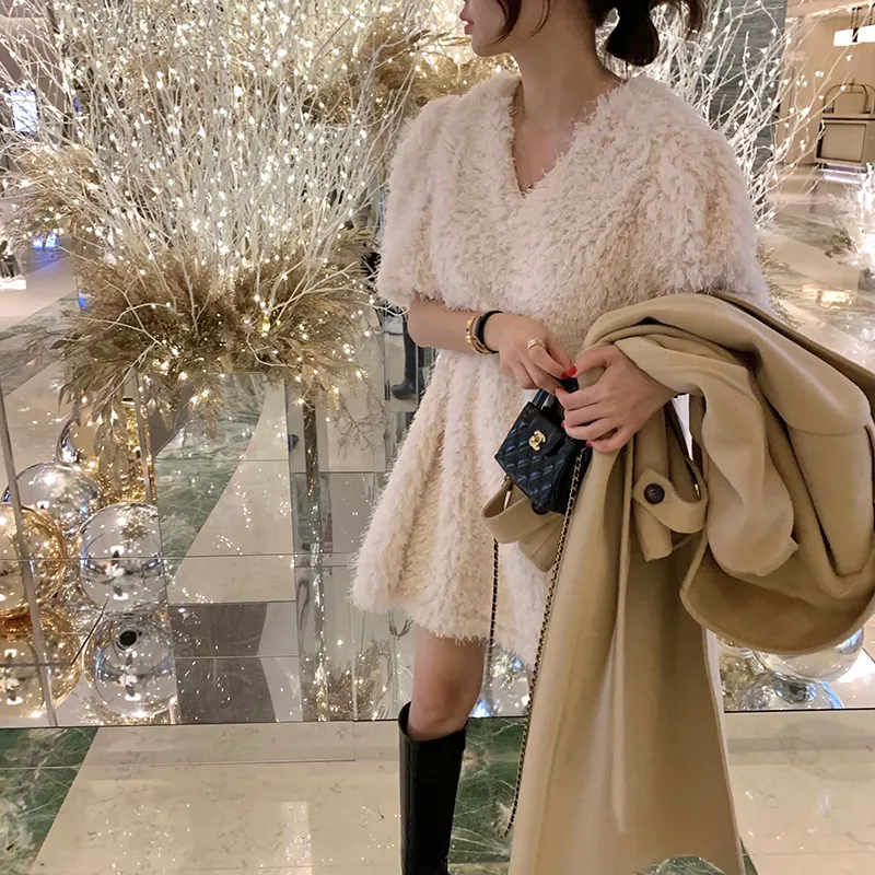 Embrace the latest Korean chic trend with this stylish V-neck fluffy dress, perfect for autumn and winter.